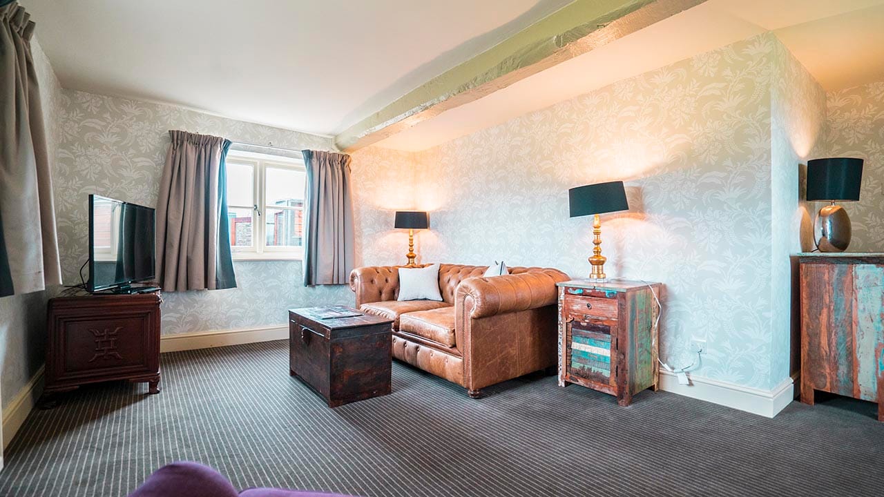 A Typical Coach House Bedroom. We have two very large courtyard suites and 1 courtyard double room with self contained facilities all with roll top baths and stunning country views. Coach House rooms have wooden beams farrow and ball paints. The Perfect place for peace and tranquillity.